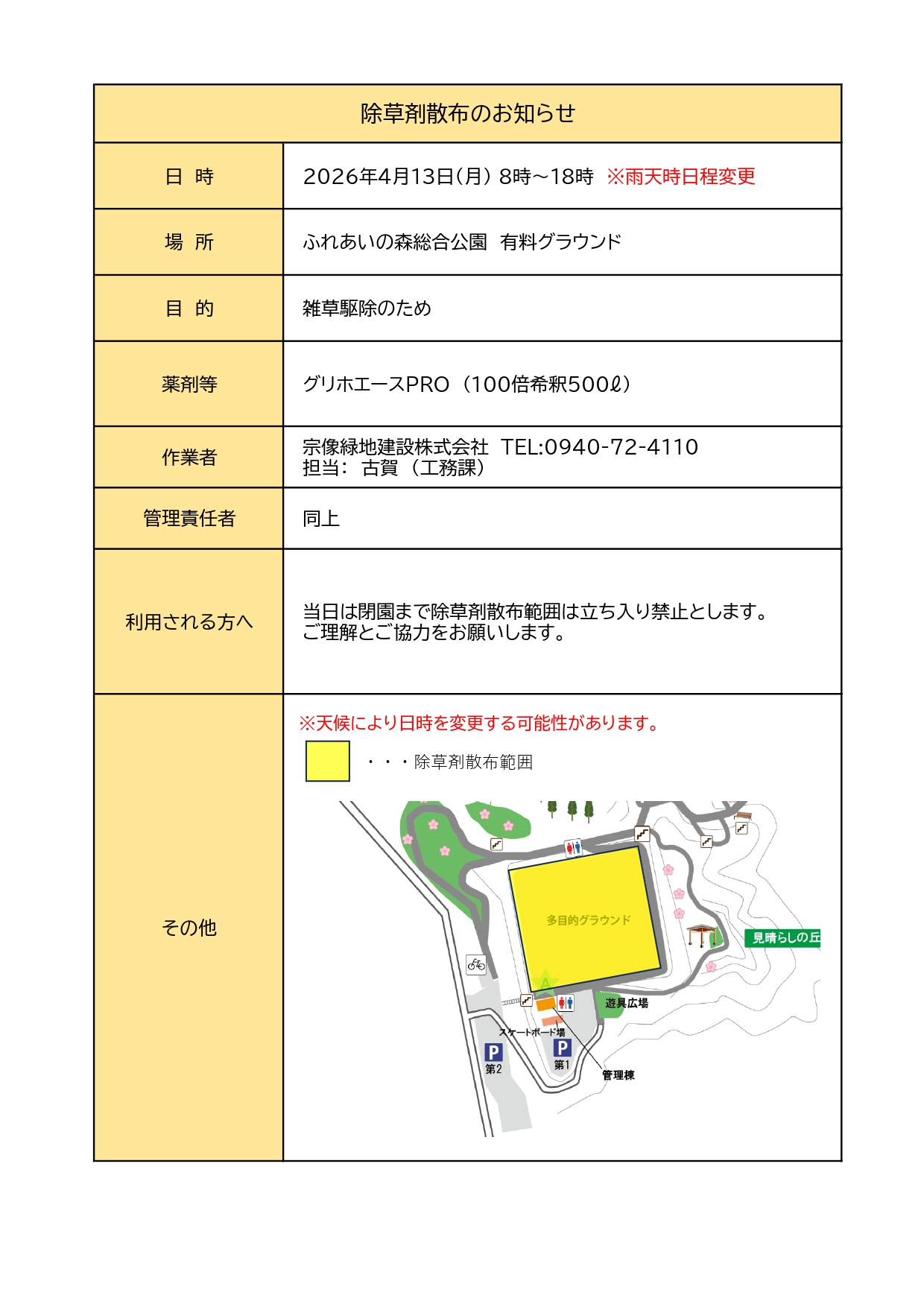 Home 新着情報 【除草剤散布のお知らせ】2026.4月13日(月)ふれあいの森有料グラウンド 【除草剤散布のお知らせ】2026.4月13日(月)ふれあいの森有料グラウンド 2026.04.2 新着情報 雑草駆除のためふれあいの森有料グラウンドにて除草剤散布を実施いたします。 ◆日程:2026年4月13日(月)8:00~18:00 ※雨天時は日程変更いたします。 ご利用のお客様にはご迷惑をおかけしますが、 ご理解・ご協力の程よろしくお願いいたします。 Tweet Share +1 Hatena Pocket feedly Pin it